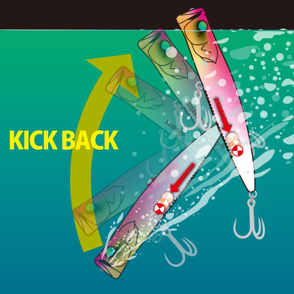 SHORT JERK: Tras un tirón, el peso del balanceador variable se desplaza hacia atrás, desplazando el centro de gravedad hacia atrás e induciendo un retroceso que devuelve el señuelo a las burbujas expulsadas de la copa.