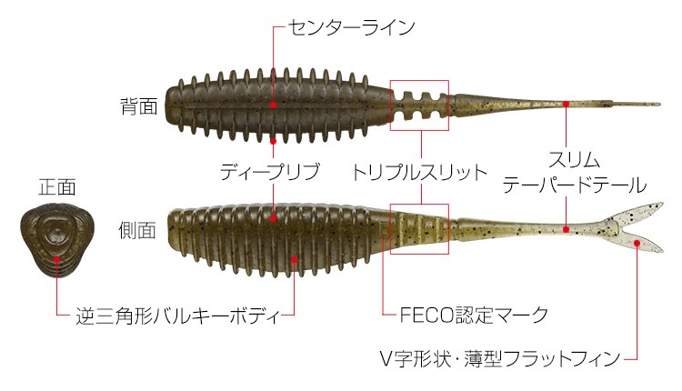 Incluso con una recogida lenta (fuerza débil), el señuelo transmite potencia y se mueve con sensibilidad, mientras que con una recogida rápida (fuerza fuerte), libera potencia adecuadamente para suprimir el movimiento excesivo, manteniendo siempre la mejor acción de natación.