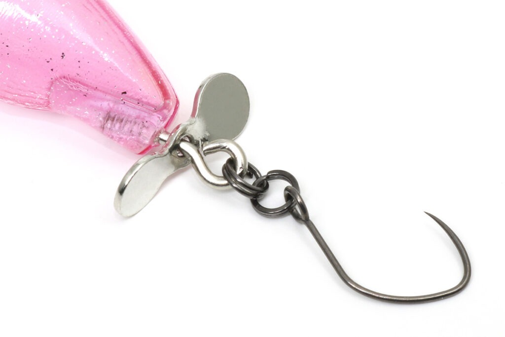 El exclusivo clip espía con punta doblada del Buzzjet distorsiona el agua, mientras que el destello intermitente de la hélice crea una corriente compleja que estimula el instinto de los peces, impulsándolos a perseguir a sus presas hacia la superficie para alimentarse. Además, imita la imagen de insectos y gránulos caídos, típicos de la zona, atrayendo a las truchas que se mantienen alerta en la superficie.
