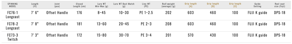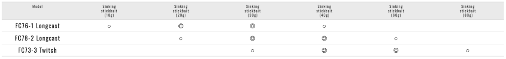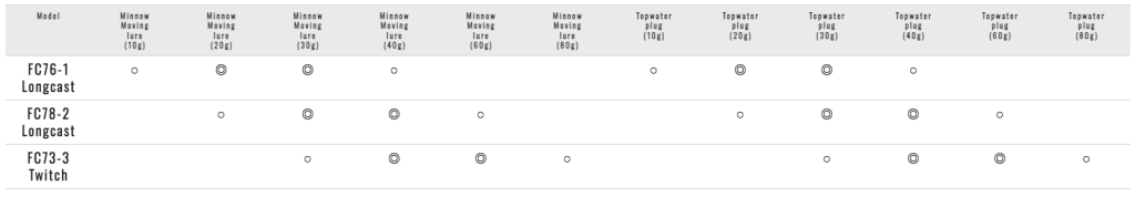 El más ligero de los dos modelos Longcast, esta caña altamente técnica permite un control sin igual de los señuelos de lubina y similares en el rango de 10-45 g. A pesar de que su sección de punta extra suave transmite los toques más ligeros para proporciones de conexión más altas, el FC76-1 tiene mucho impacto para funcionar el día que los elefantes comen maní.