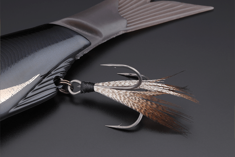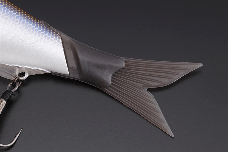 Se utiliza una cola de silicona dura para generar un fuerte impulso en el agua cuando el señuelo está en acción. Además, es resistente a las torceduras.
