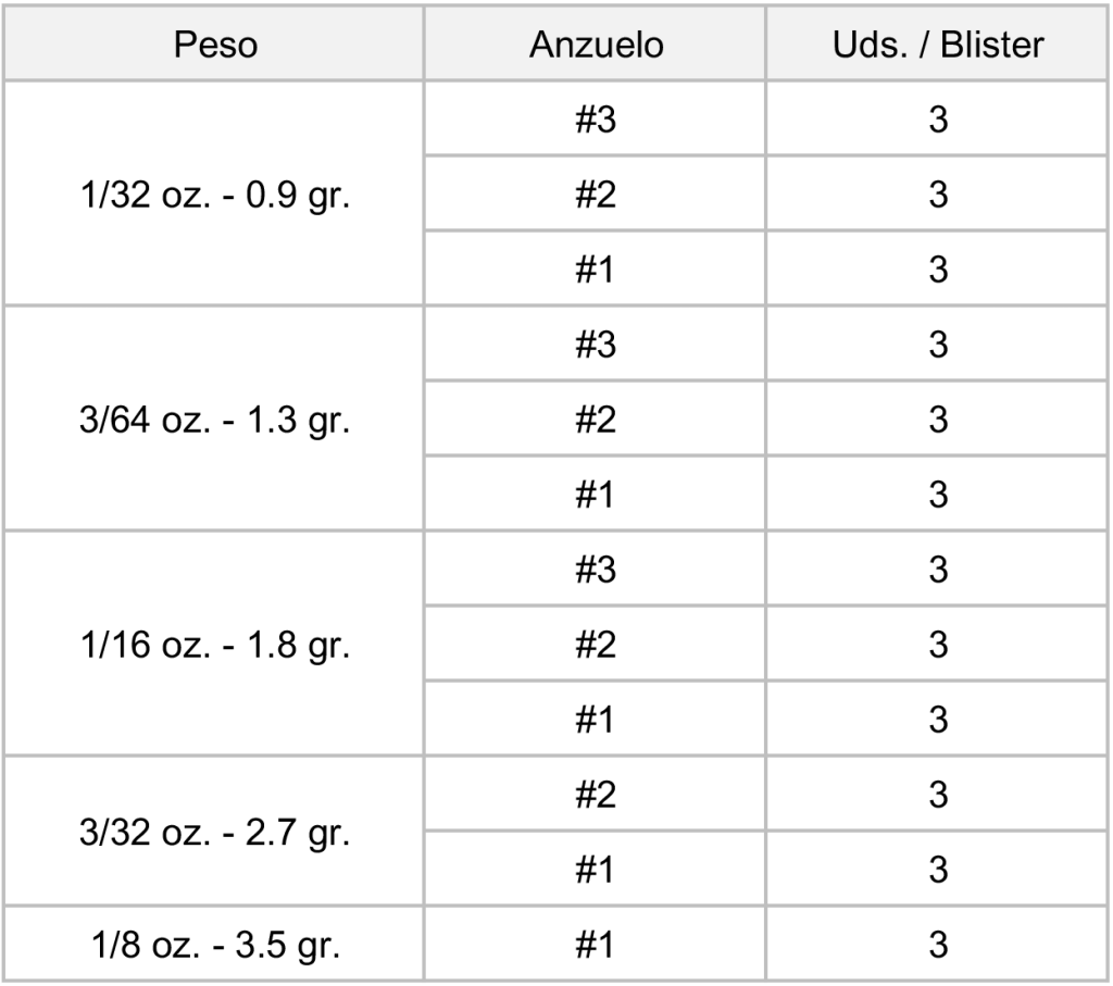 Este fantástico jig head dispone de un anti-algas muy eficaz en titanio, y cabe destacar que en todas las medidas en las que se fabrica hay un anzuelo con formato #1.