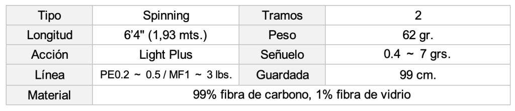 Es ideal para todo tipo de pesca de corta a media distancia con montajes y señuelos de hasta 7 g. Es un modelo corto, delicado y ágil, de clase ligera, pero al doblarlo, ofrece una fuerte sensación de torsión.