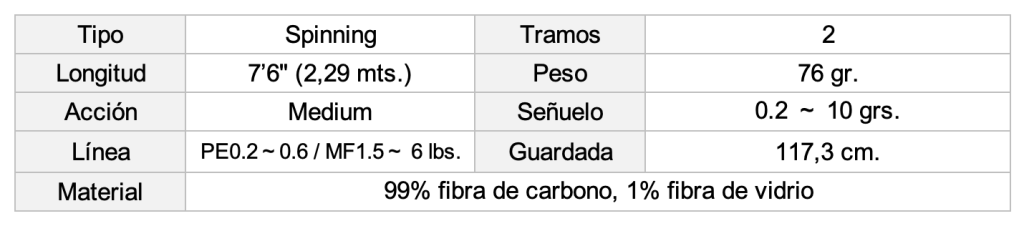 Los blanks son afilados pero se flexionan suavemente y ejercen torque cuando están cargados, gracias al diseño cónico desarrollado en el linaje del ultrasensible Salty Sensation y la combinación activa de materiales de carbono de elasticidad media de 24t y 30t. Para mejorar la ligereza y la agilidad, los blanks no están pintados y están lijados, excepto el logotipo de la culata.