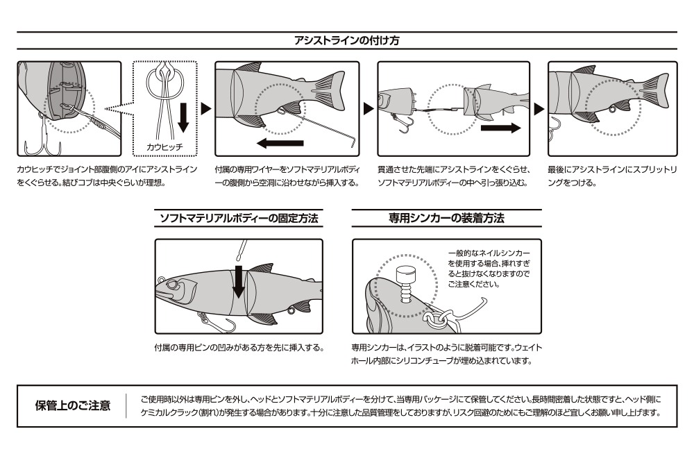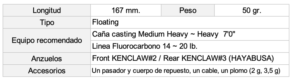■ Recuperar fácilmente: Imita la natación de un señuelo real. La cola de pez se balancea de un lado a otro, activando a los basses que la persiguen sin resultar excesivamente atractiva. Se puede usar para una amplia gama de velocidades de recuperación, desde muy lenta hasta rápida. Se puede controlar la distancia al objetivo con el plomo.