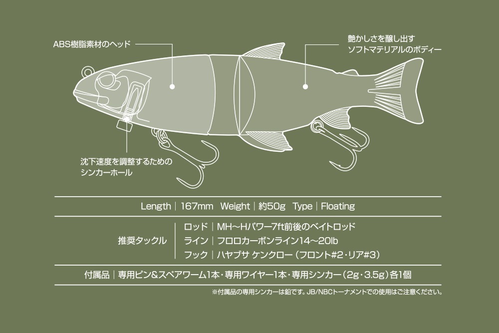 La cabeza de material duro del Nichika 167F permite un fácil ajuste de la flotabilidad, mientras que la cola de material blando proporciona un impulso natural. Este swimbait híbrido y de apariencia natural es compatible con una amplia gama de velocidades de recuperación. Su acción básica consiste en recuperarlo lentamente por encima de la altura de los ojos del bass. Mantiene una posición horizontal, con la cola balanceándose regularmente, mientras que la parte delantera del cuerpo la sigue sin ningún movimiento innecesario, creando un vibrante bamboleo que se asemeja al de un pez pasto indefenso. Incluso motiva a los basses grandes y astutos que se encuentran en los remansos de los grandes lagos a alimentarse. Bajo presión, el Nichika 167F sin duda destacará.