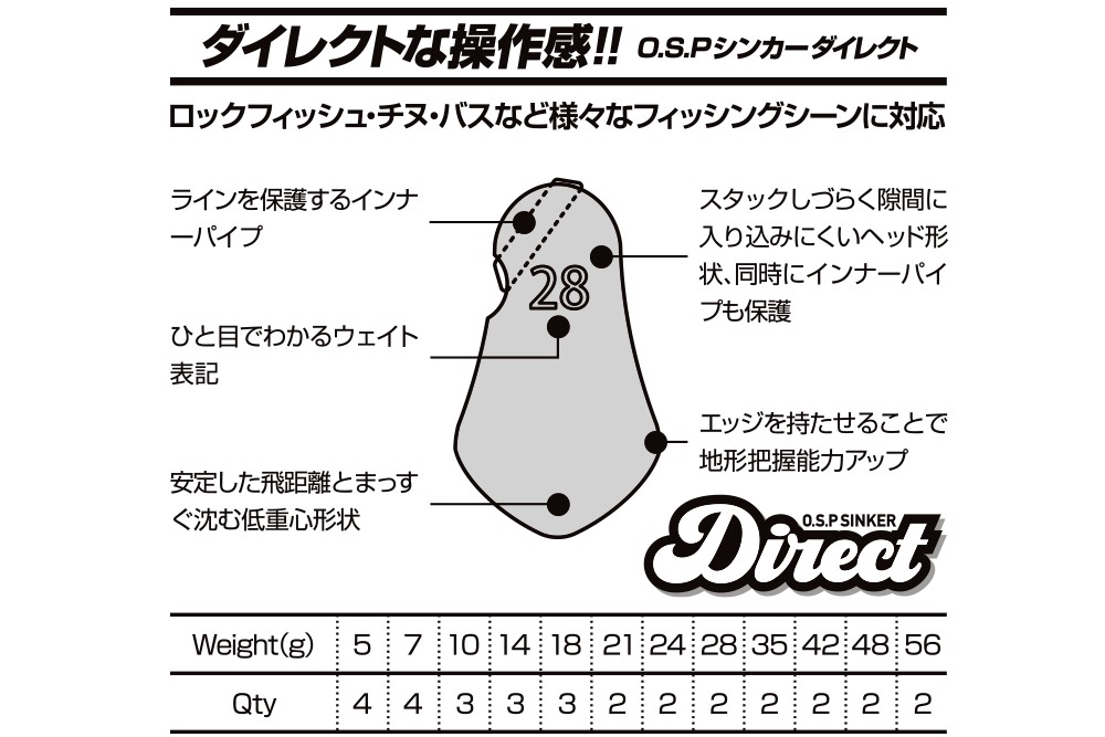 El OSP Sinker Direct es un plomo diseñado para la pesca de fondo, en una amplia gama de escenarios, independientemente de la especie. El rendimiento requerido es un buen lance, un hundimiento rápido y recto, y una alta capacidad para percibir el fondo evitando obstáculos.