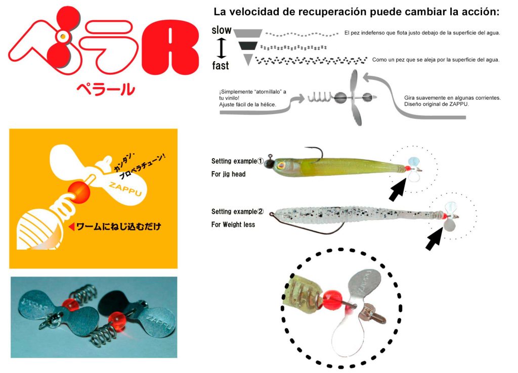 Hélice ultra-fina que se puede ensamblar rápidamente a jig heads, no-sinkers y varios tipos de vinilo. Su trabajo principal es el de girar y agitar el fondo y sus alrededores, entre otros varios usos. Variar la velocidad puede cambiar la acción de la hélice a su voluntad. El más mínimo flujo de agua mueve esta hélice original con una rotación suave.