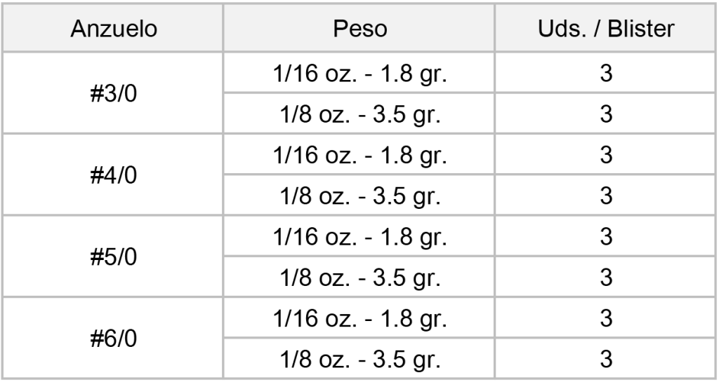 Para poder afrontar con garantías cualquier eventualidad que se nos pueda presentar, dispone de cuatro tallas de anzuelo diferentes, con dos pesos estándar para cada una de ellas.