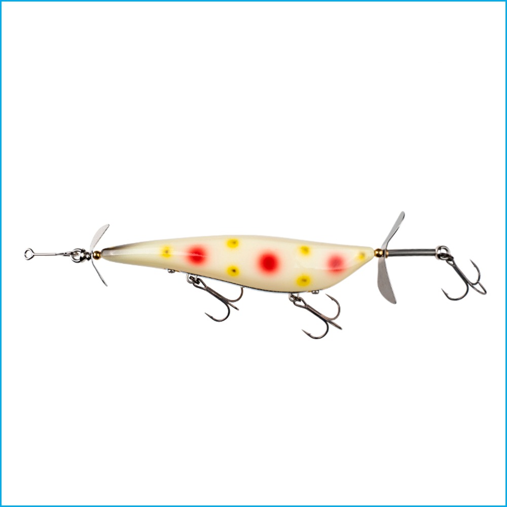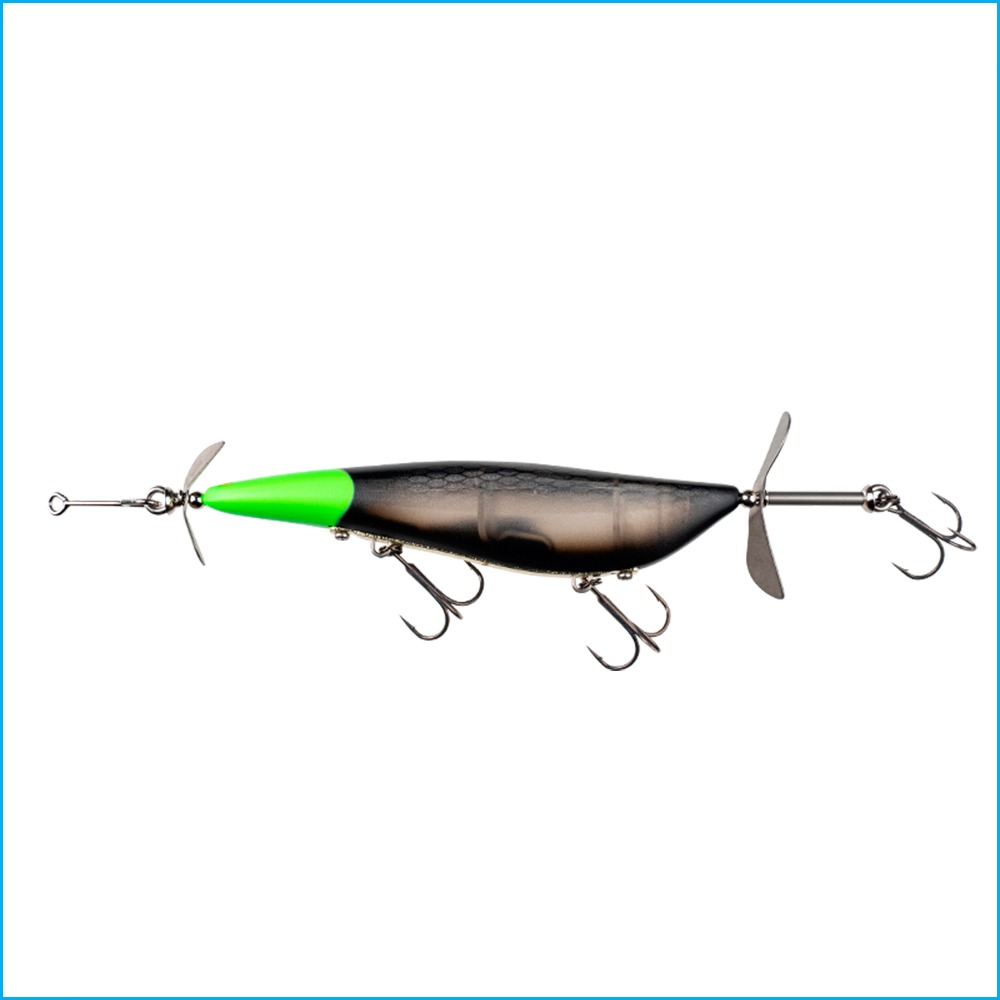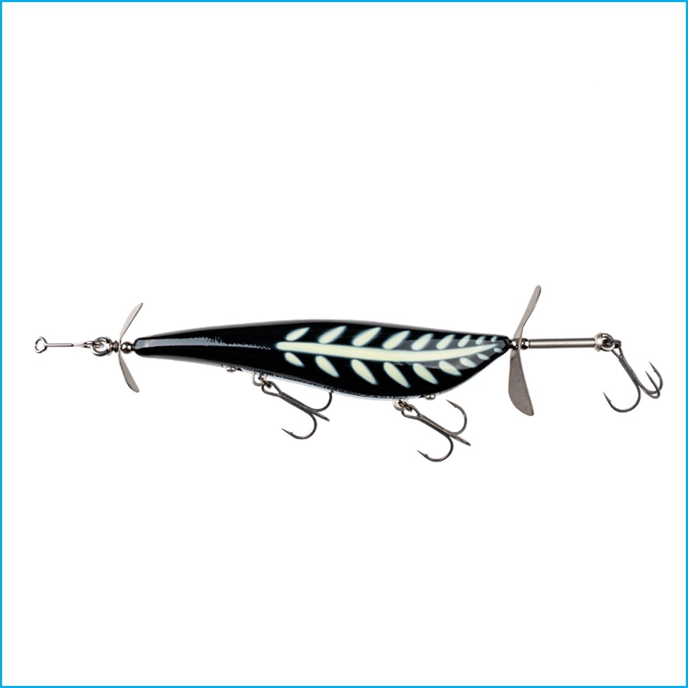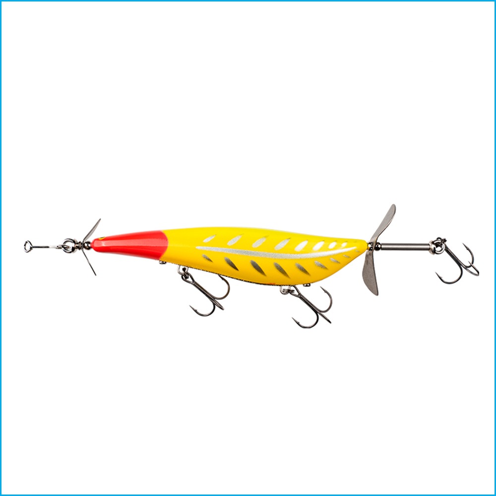 El peso en la parte exterior del cuerpo permite un centro de gravedad bajo, evitando que el señuelo se desvíe por la fuerza de la hélice.