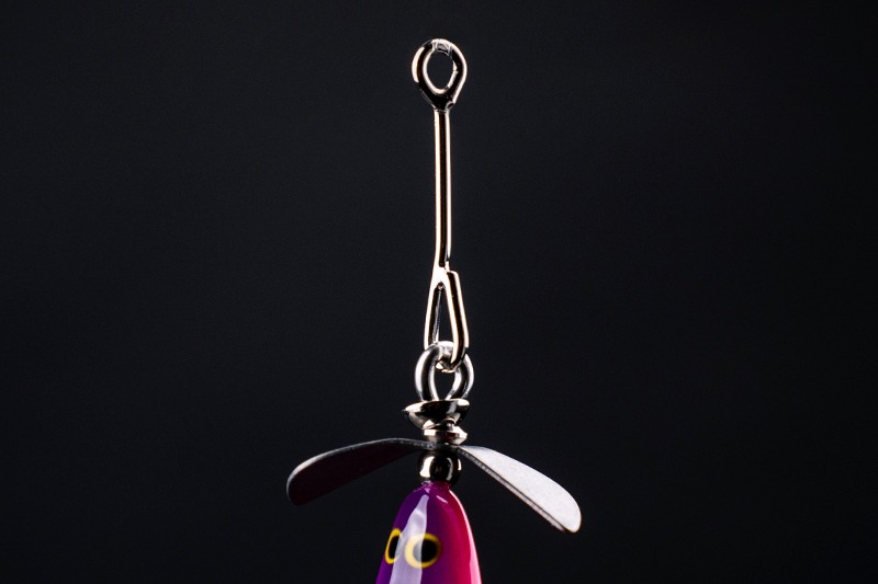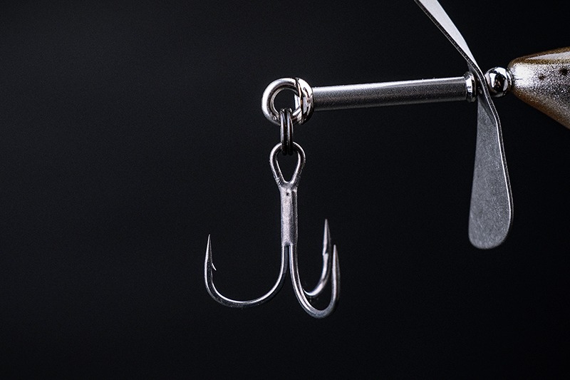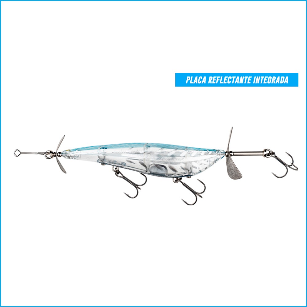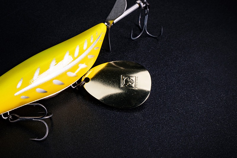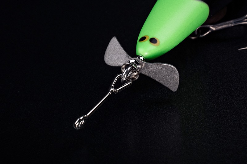 Al colocar la cuchilla personalizada incluida en el ojo central, puede modificar las especificaciones para un modelo adecuado para recuperaciones a baja velocidad. Como la cuchilla y la hélice trasera hacen contacto irregular durante el bamboleo, se genera un sonido metálico que atrae la atención del bass. Esta acción irregular también sirve como detonante para la picada.