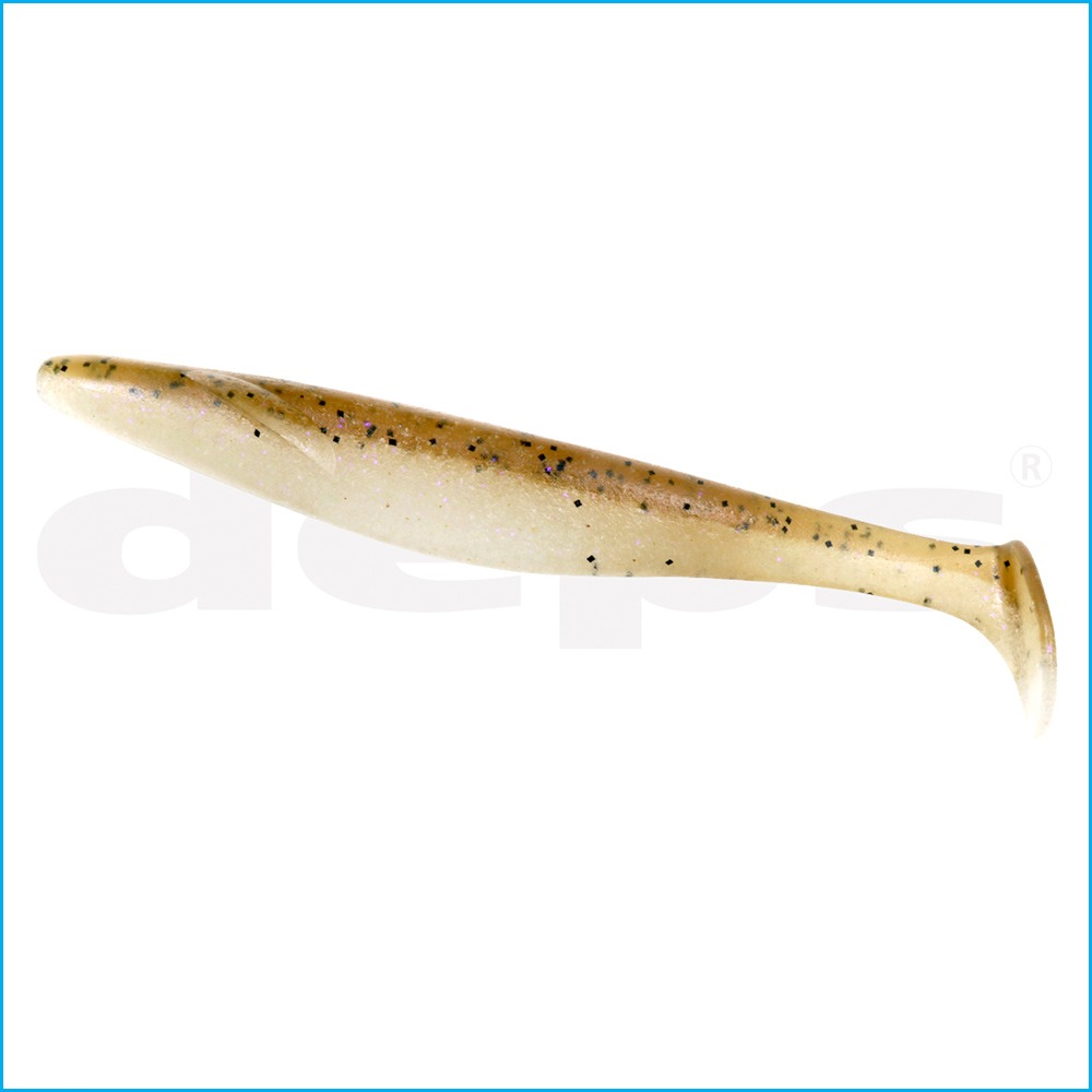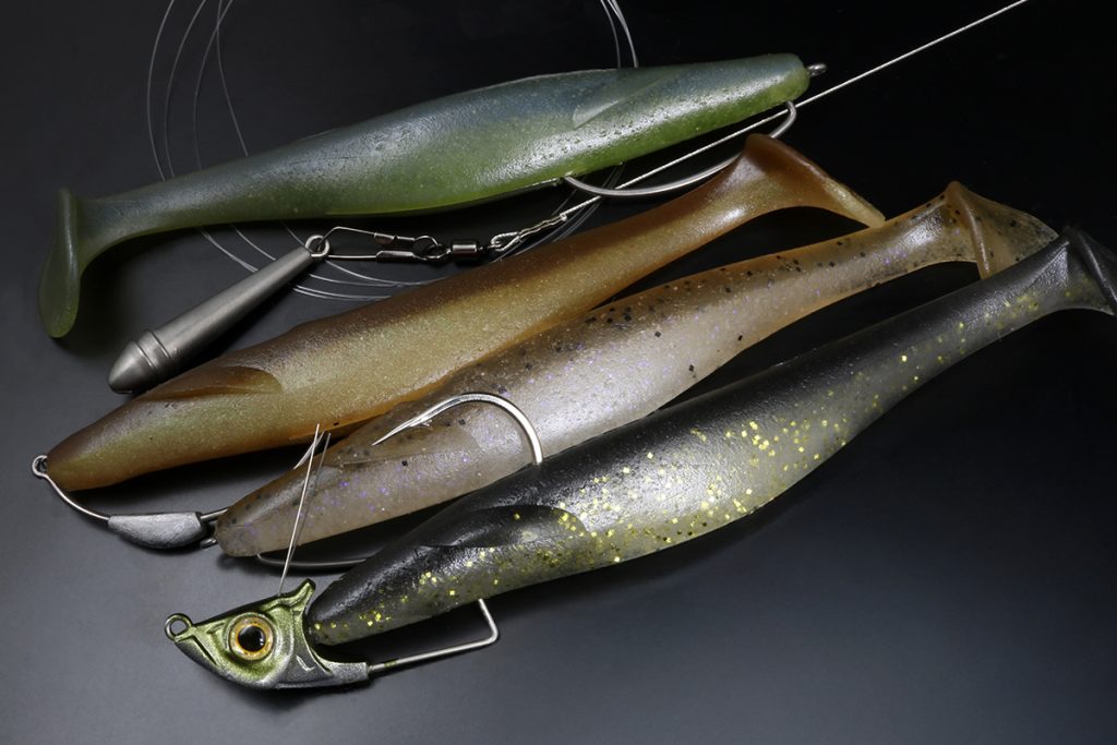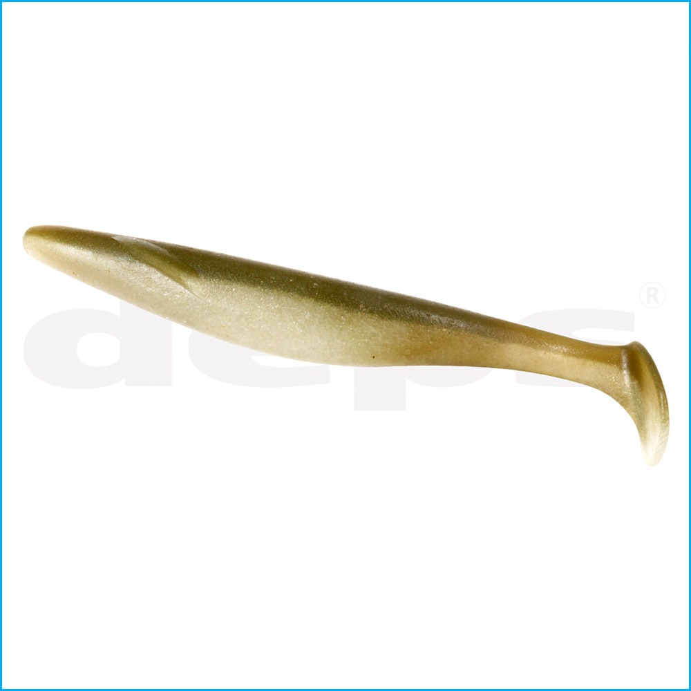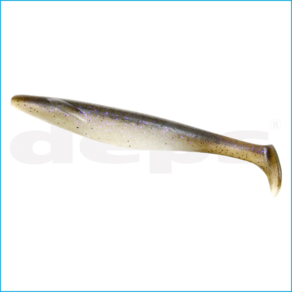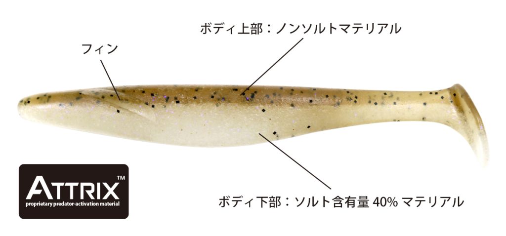 El material de la parte inferior del cuerpo presenta un centro de gravedad bajo gracias a su máximo contenido en sal, y la postura estable de natación del señuelo le permite un buen agarre en el agua y es compatible con recuperaciones tanto lentas como rápidas. Este señuelo de cola de sábalo ofrece una amplia zona de ataque y un fácil control del alcance, lo que lo hace ideal para nadar con montajes sin plomo y de trailer de swim jig, así como para Texas.