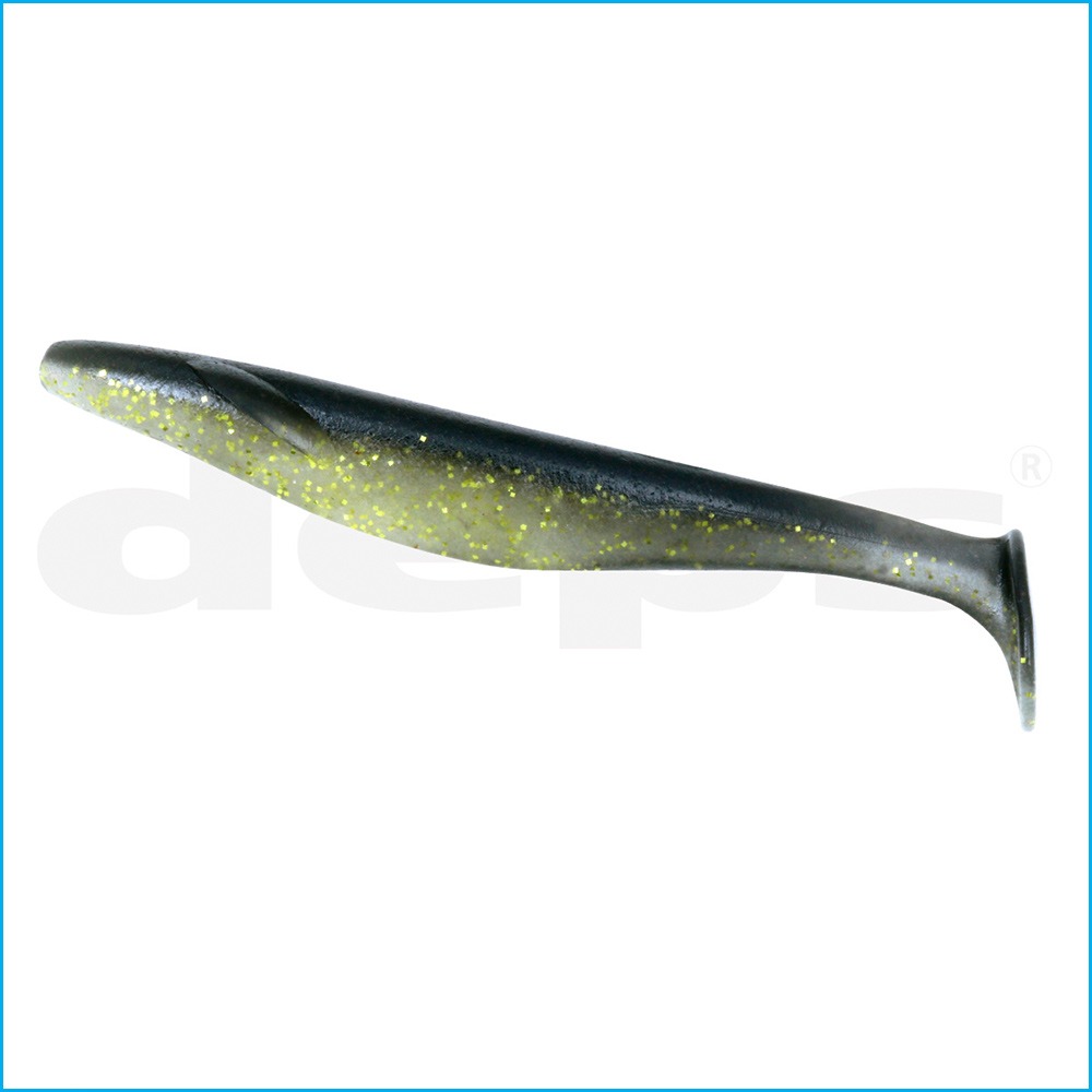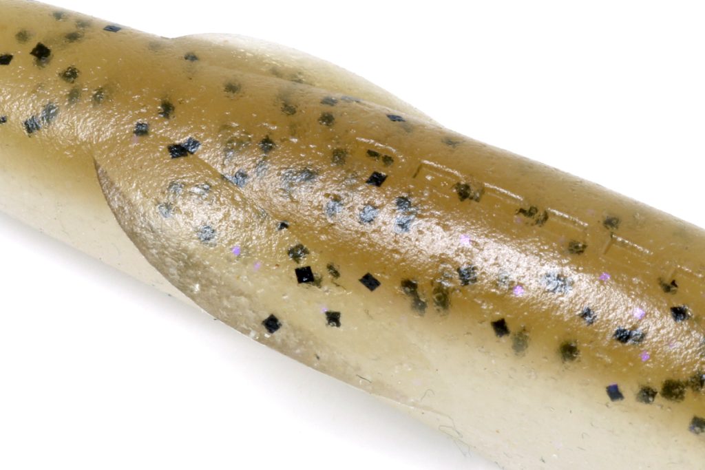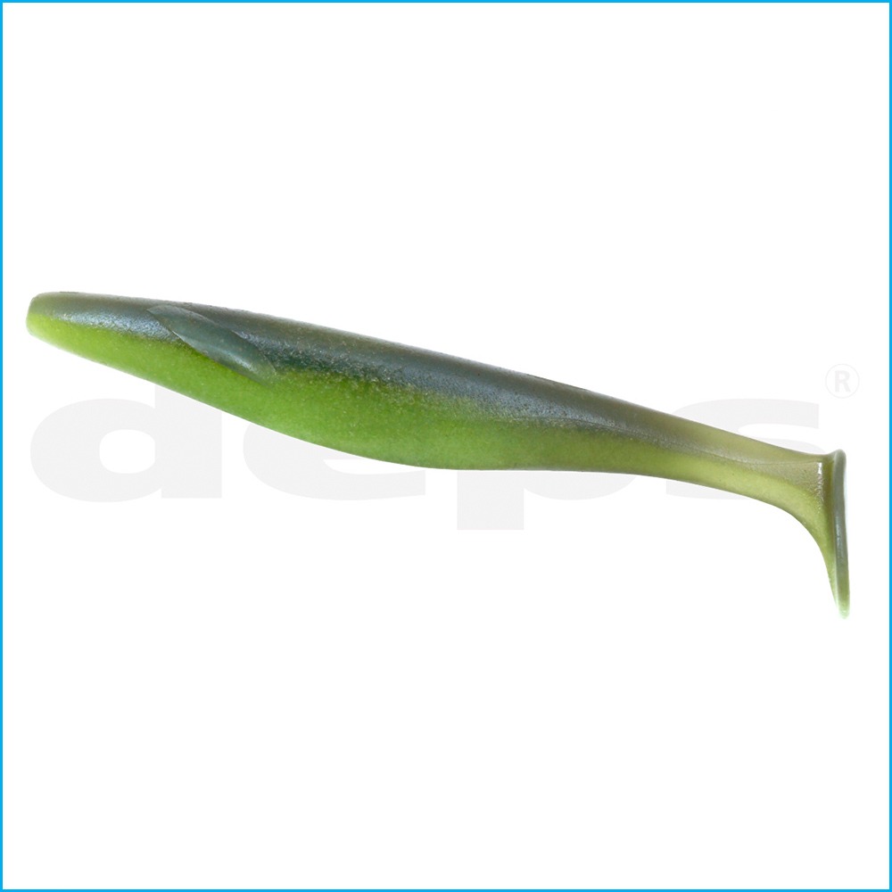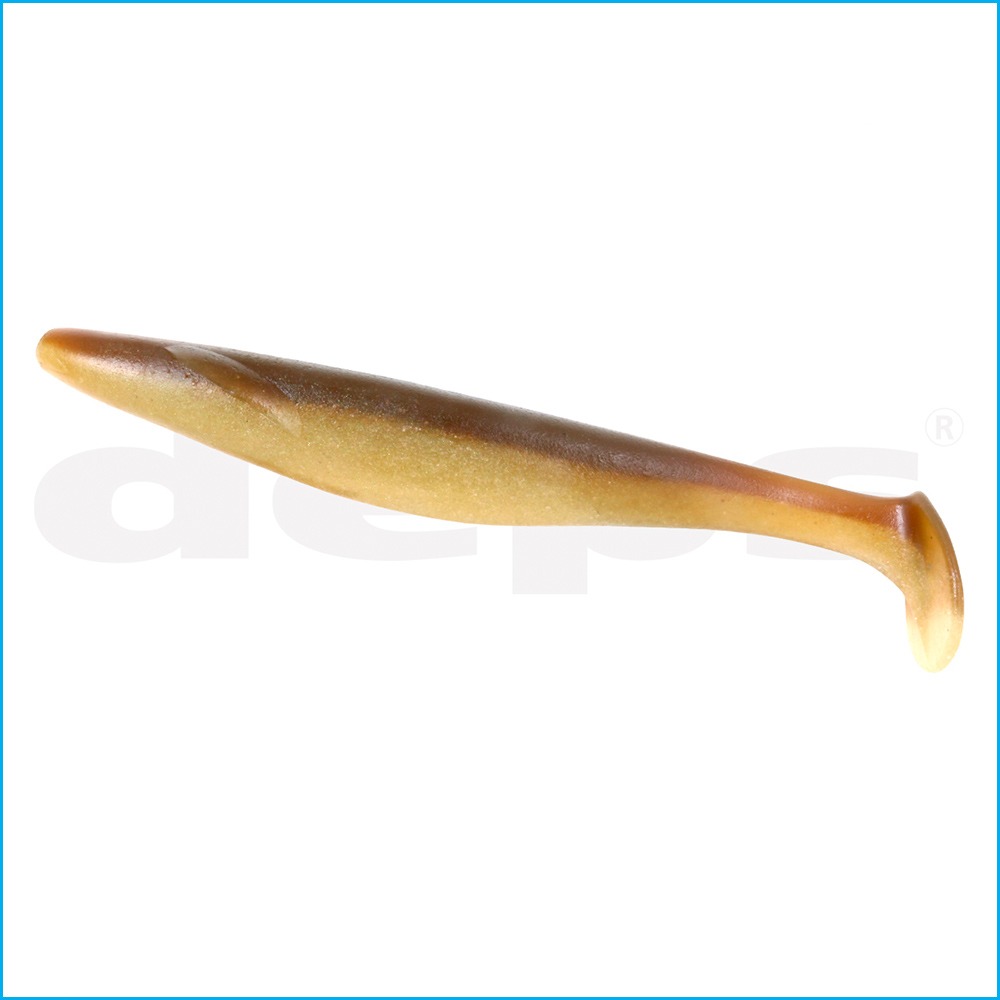 El material de la parte inferior del cuerpo presenta un centro de gravedad bajo gracias a su máximo contenido en sal, y la postura estable de natación del señuelo le permite un buen agarre en el agua y es compatible con recuperaciones tanto lentas como rápidas. Este señuelo de cola de sábalo ofrece una amplia zona de ataque y un fácil control del alcance, lo que lo hace ideal para nadar con montajes sin plomo y de trailer de swim jig, así como para Texas.