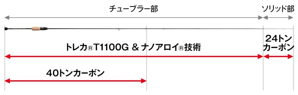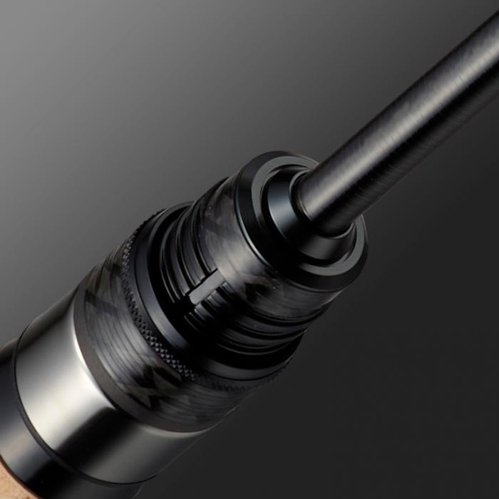 La sección del talón está hecha principalmente del mismo carbono de 33 toneladas que la sección del centro y carbono de 40 toneladas con un módulo elástico más alto, lo que le proporciona una tensión que mejora la respuesta operativa. Mientras tanto, el diseño de conicidad baja y bobinado delgado enfatiza una flexión suave bajo cargas elevadas, mejorando la sensación de lance en aparejos ligeros y la absorción de impactos en líneas ligeras. Además, al omitir deliberadamente el refuerzo de cuatro ejes desde la culata hasta la empuñadura, se ha buscado una ligereza aún mayor y una mayor flexibilidad.