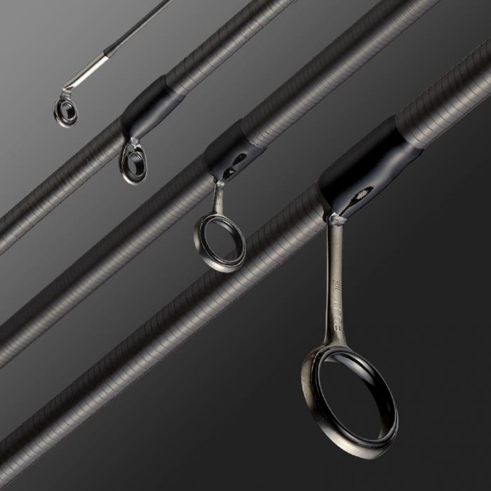 En comparación con las guías de anillas SiC del mismo tamaño, se ha adoptado activamente guías de anillas Torzite con marco de titanio, que presentan un diámetro interior más amplio gracias al grosor del anillo y mejoran el deslizamiento de la línea gracias a las características de su superficie.