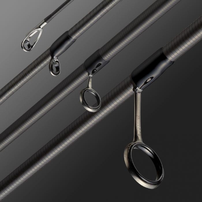La guía superior, propensa a inclinar la línea, utiliza una guía de anilla de SiC con marco de titanio con una sección transversal suave que evita que la línea forme un ángulo agudo.