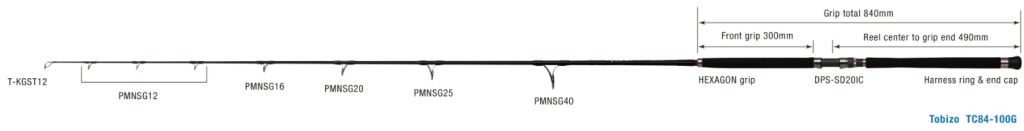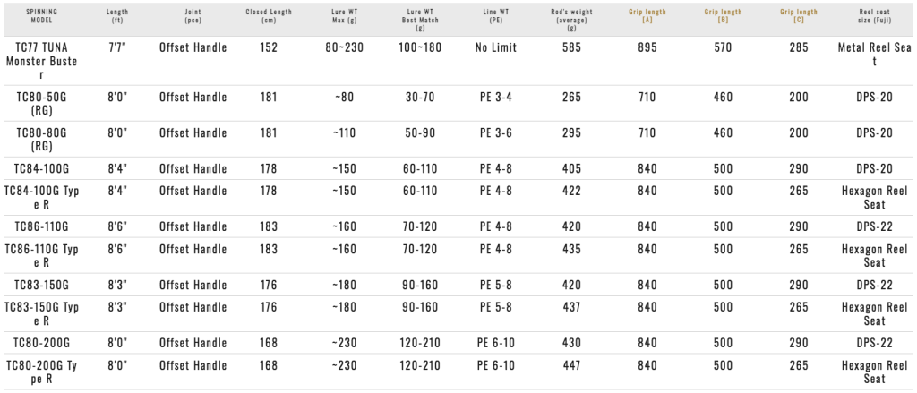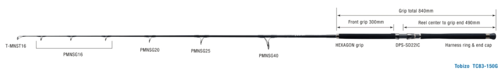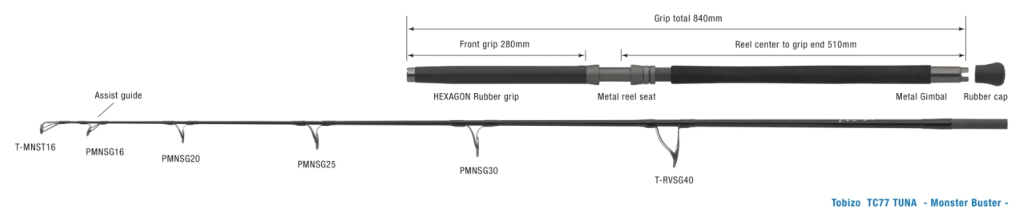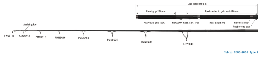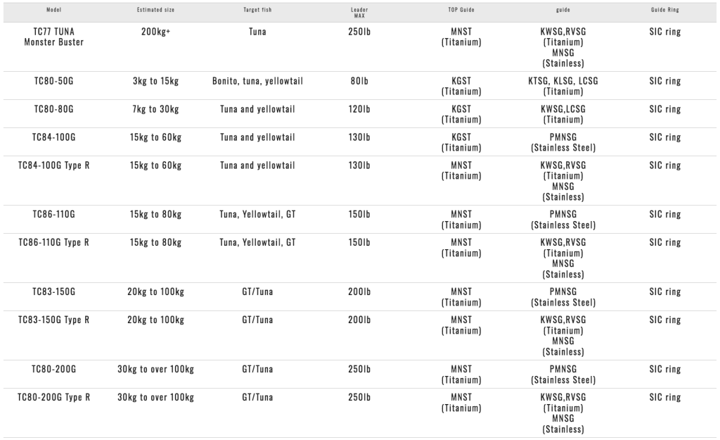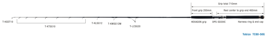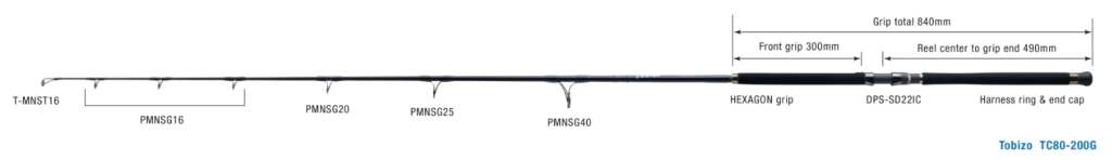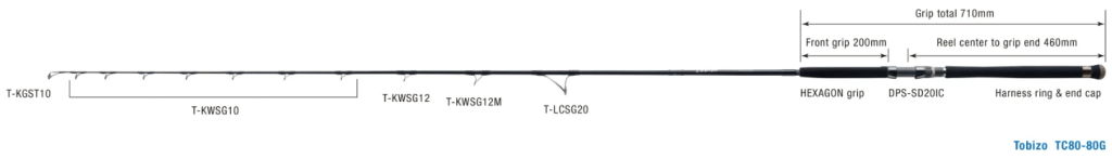 La TC80-200G es el modelo más fuerte de toda la línea Tobizo. Esta caña es utilizada por pescadores que intentan apuntar a atunes gigantes y GT que rompen récords. La sección del vientre de la caña es perfecta para lanzar señuelos de 200 gr., mientras que la empuñadura tiene el poder de sacar peces del arrecife. La transición perfecta de estas características del blank, hace de esta caña una herramienta muy efectiva y versátil para peces grandes. El blank ultrarresistente TC80-200G es un arma de elección para los pescadores expertos y está tan bien equilibrado que cualquier pescador puede empuñarlo con autoridad.