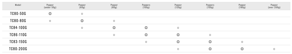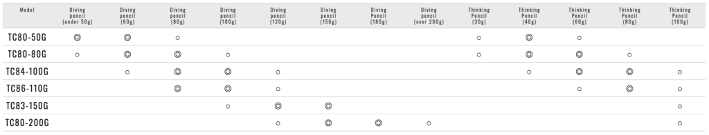 Se destaca en el lanzamiento a larga distancia de señuelos de 60 g a 150 g, y puede apuntar a ciertos puntos en la bola de cebo nunca alcanzados antes. En una partida de lanzamiento de atún, incluso un señuelo ligero de unos 40 g puede generar suficiente distancia de lanzamiento y una acción de señuelo atractiva. Tiene una potencia en el trasero que supone que sus objetivos principales son atunes de 30 kg a 50 kg. En la prueba de campo, capturó atunes de aleta amarilla de más de 70 kg sin problemas. Además, suponiendo una lucha prolongada particular para las partidas de atún, tiene la capacidad de abordar atunes grandes mientras minimiza la carga en el cuerpo del pescador. La TC84-100G mejorará en gran medida su tasa de captura de atún.