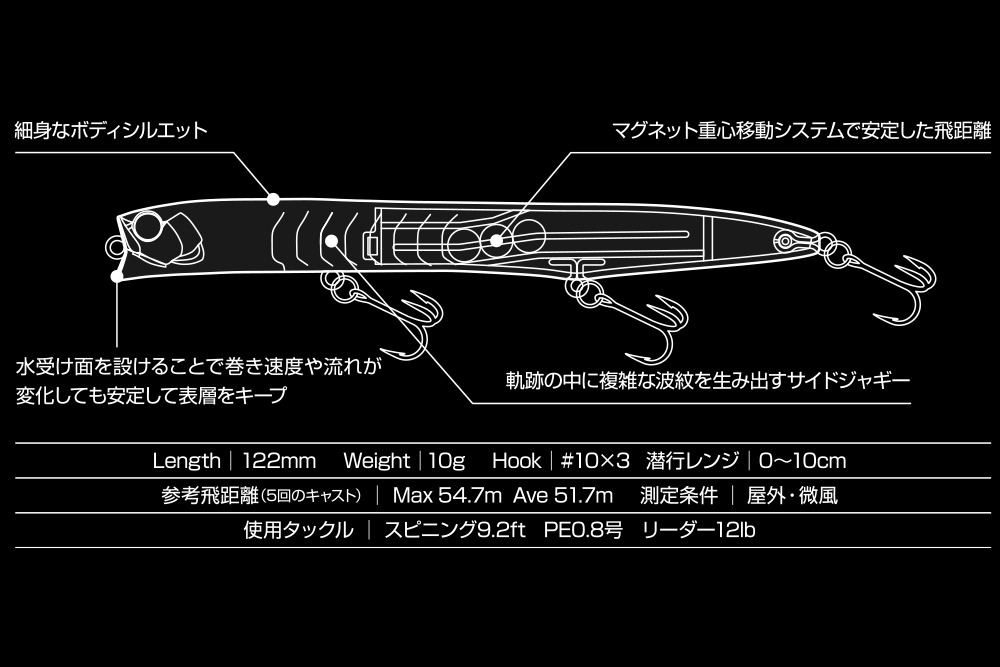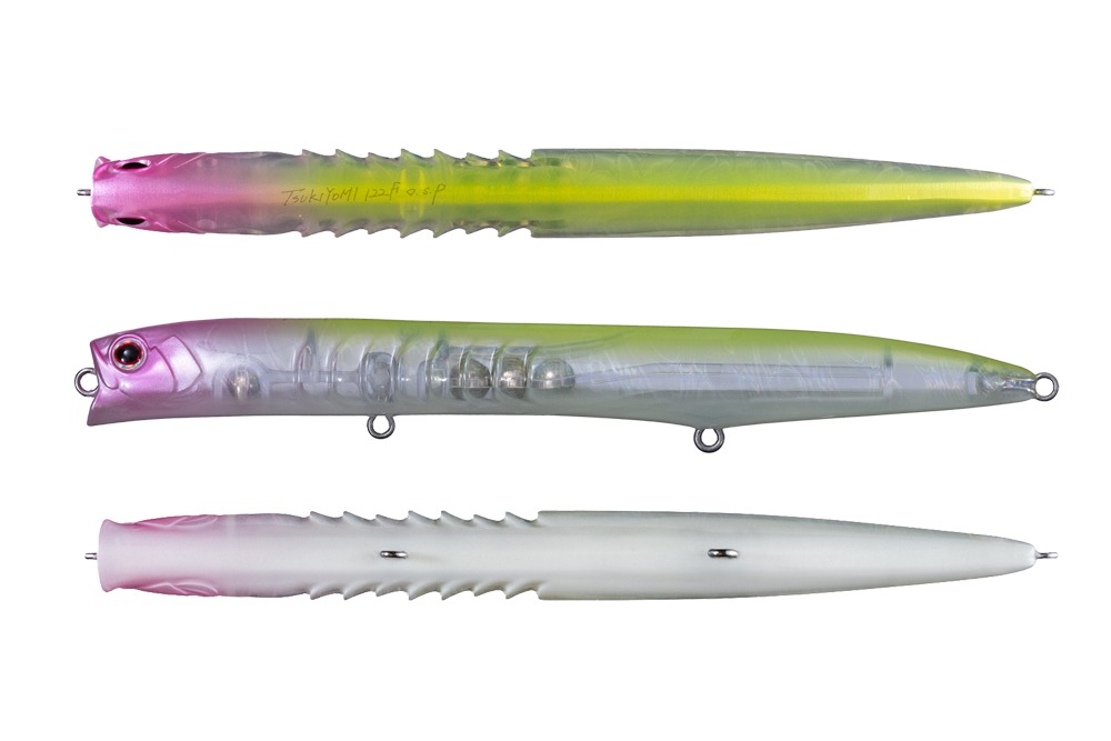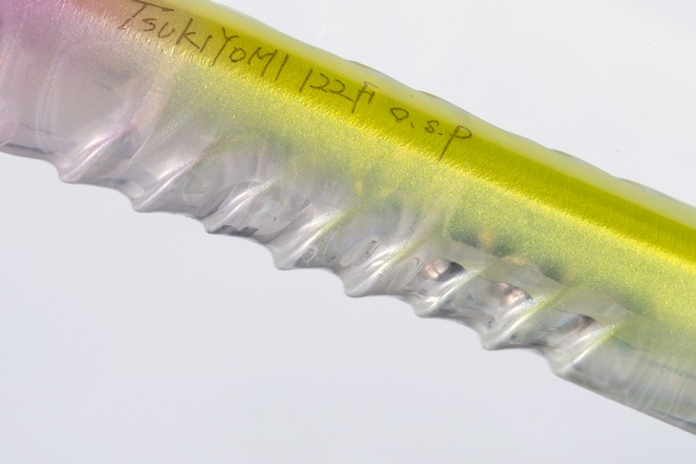 Los señuelos con siluetas delgadas y vibraciones débiles tienden a carecer de una sensación real. Para superar este inconveniente, nos esforzamos al máximo en diseño e ingeniería. El Tsukiyomi es un minnow flotante que ofrece a los pescadores una sensación de control sólida y un rendimiento general mejorado, lo que facilita su uso y captura. Al permitir que tanto la superficie receptora de agua en la boca como las nervaduras laterales con mayor superficie reciban las corrientes, el señuelo mantiene su acción de vibración débil a la vez que mejora la sensación de recogida. Captura con claridad información subacuática difícil de obtener con señuelos delgados y de baja resistencia, lo que le permite responder rápidamente a los cambios de velocidad de la corriente. Al lanzarlo lentamente, nada en forma de I, creando una estela desde la cabeza hasta la cola. Al ser atrapado por una corriente, cambia gradualmente la posición de la estela desde las nervaduras laterales hasta la cola, lo que resulta en una acción de balanceo. Su postura estable y horizontal y su acción débil atraen incluso a las lubinas más exigentes.