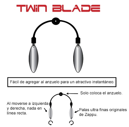 Ha sido diseñado para que sus palas giren de forma inversa. Es decir, cuando acoplamos el Twin Blade en nuestro señuelo y empezamos a recuperar línea por medio del carrete, una pala gira a la izquierda, y al mismo tiempo, la otra gira a la derecha. Incluso siguen girando si dejamos el señuelo en caída libre.