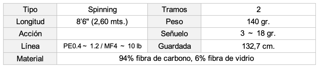 La punta está equipada con una punta sólida de vidrio extremadamente flexible. Al minimizar la longitud de la punta sólida, está diseñada para picar sin sensación de lentitud al usarla. La pintura plateada clara, muy visible, permite detectar visualmente picadas que podrían pasar desapercibidas con la mano. El blank es ligero y muy sensible, con un contenido mínimo de resina y una mayor densidad de carbono. La sección del mango está reforzada con Quattro Cross de 4 ejes para eliminar el bamboleo del blank y la pérdida de potencia, logrando una alta operatividad y facilidad de lanzamiento, así como la potencia necesaria para soportar lubinas en la corriente.